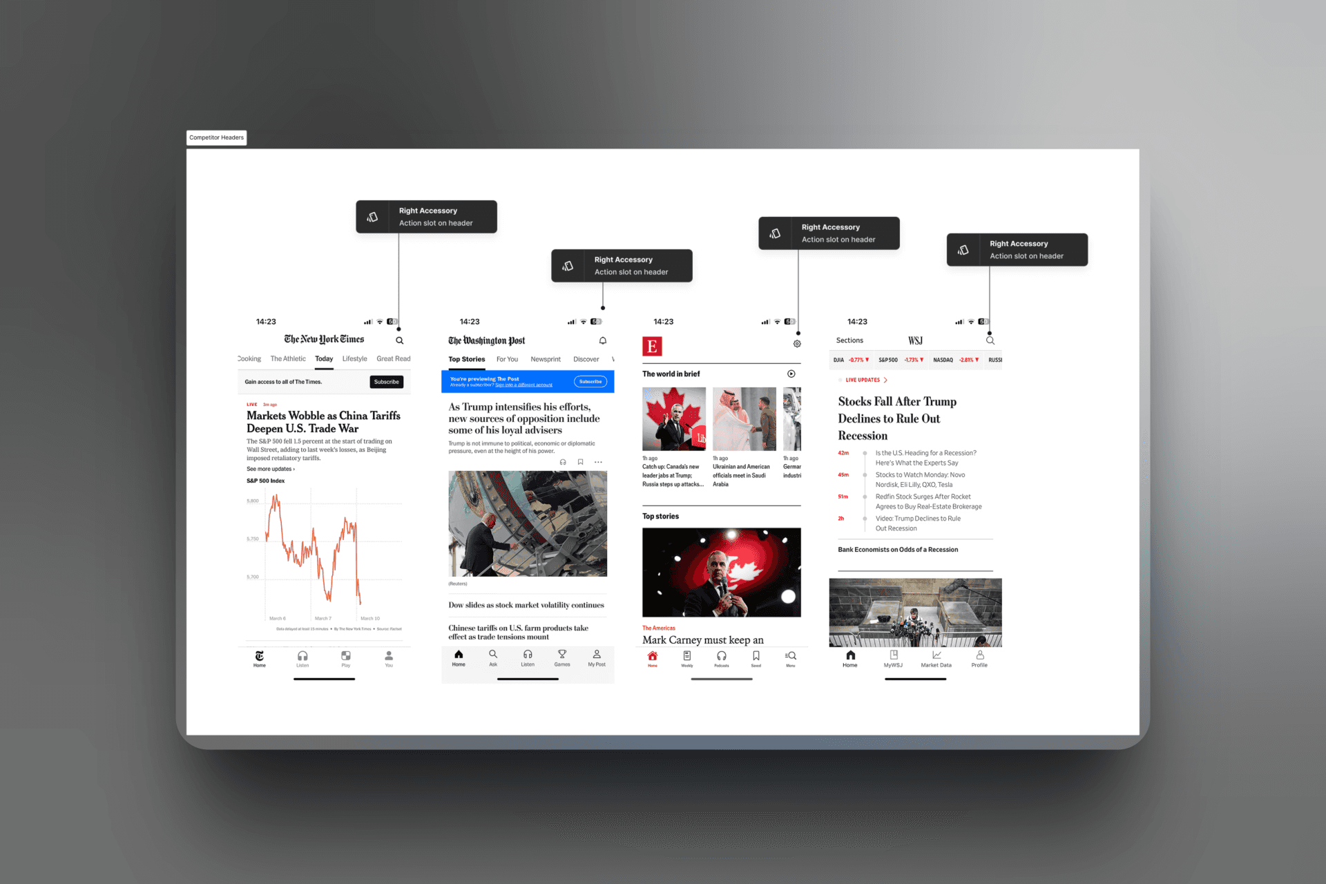 • Competitive benchmarking: I studied how similar publishers (The New York Times) had successfully integrated niche products (like NYT Cooking) into their main apps, extracting lessons about navigation, subscription management, and user onboarding. (This gave us lots of ideas to start tesing in the design phase)